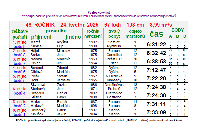 Přehled posádek, které se umístily do devátého bodovaného místa v absolutním pořadí Vodáckého maratonu na Berounce.